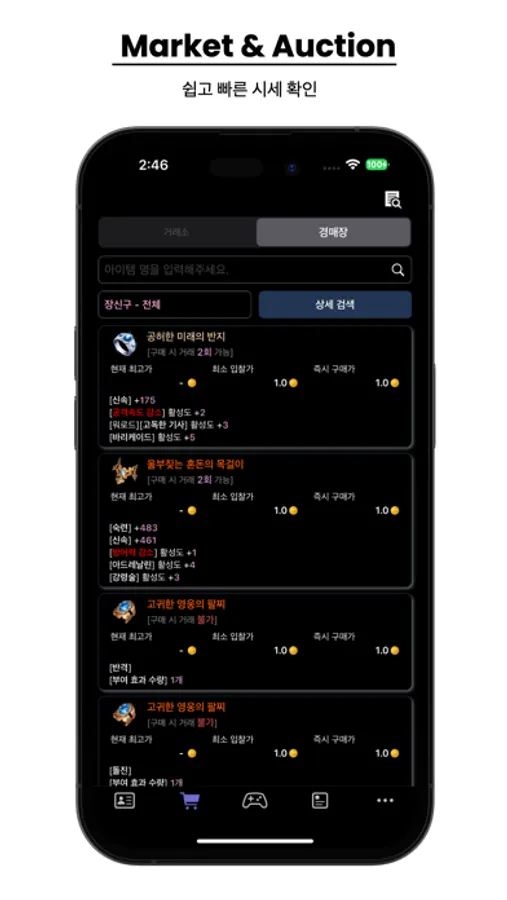 • 게임에 접속 하지 않아도 거래소 및 경매장 시세를 확인 할 수 있습니다.