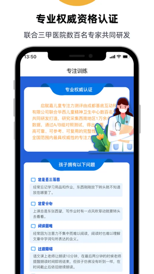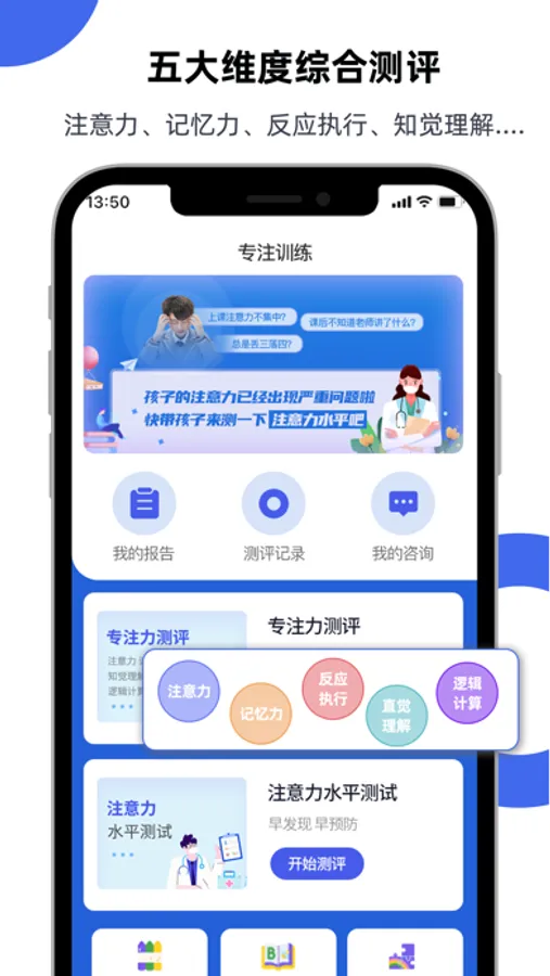 专注力测评app不仅融合了传统的舒尔特训练、听音选择、逻辑推理等注意力快速集中性测评内容还添加了注意力测评、记忆力测评、逻辑与计算能力测评、知觉与理解能力测评、反应与执行能力测评等强化内容,是目前全国最权威性的专注力水平测试系统。