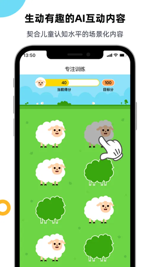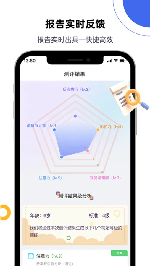 通过生动有趣的AI互动测评,从注意力、记忆力、逻辑与计算能力、知觉与理解能力、反应与执行能力五大维度科学判定孩子的专注力整体水平,并根据测评结果定制后期训练计划。