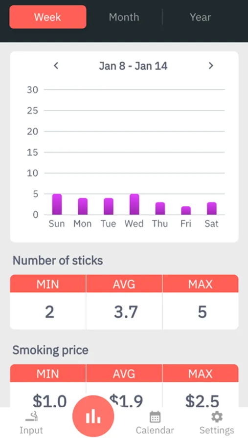 In addition, the Chart screen allows you to check the number of cigarettes smoked per week, month, and year, as well as the amount of money spent.