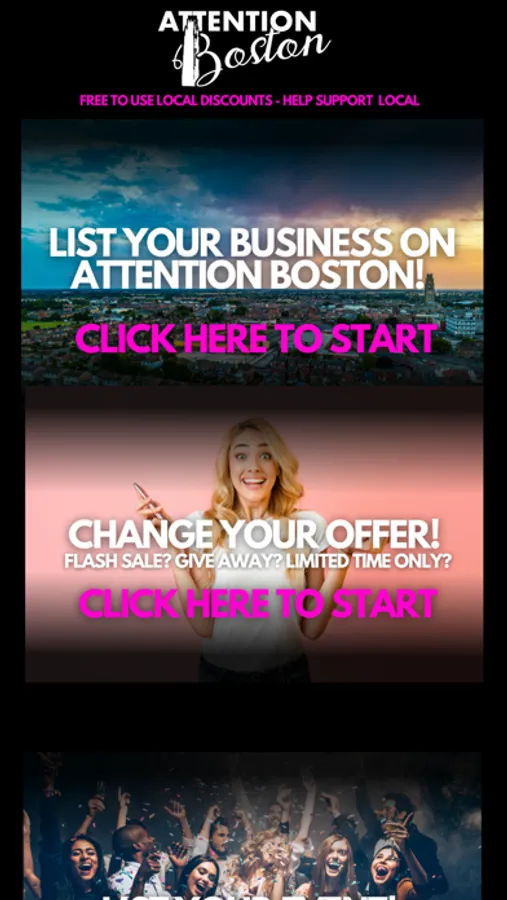 At Attention Boston we are passionate about bringing people together with our platform – connecting consumers with businesses who have fantastic offers available along with providing business owners a great platform to promote their products or services at an affordable price point. With our easy to use mobile app you will be able to access unbeatable deals with no sign up fees, costs or in app purchases!