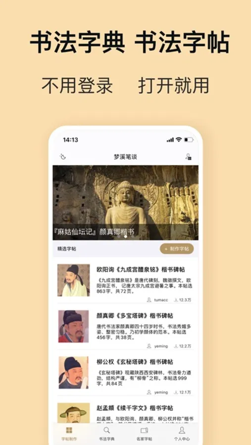 梦溪笔坛APP是一款书法学习软件,无需登录注册,不强制绑定手机号,打开APP即可使用。