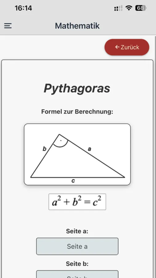 Die Multitool Formelsammlung ermöglicht es Nutzern, wichtige Formeln aus Mathematik und Physik anschaulich zu nutzen und zu berechnen. Mit der App können Sie beispielsweise den Satz des Pythagoras anwenden, um die Länge der Hypothenuse in einem rechtwinkligen Dreieck zu bestimmen.