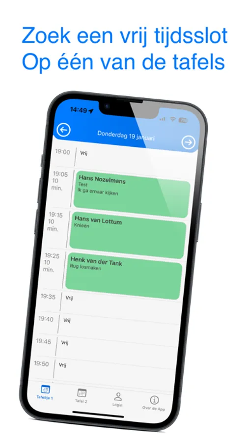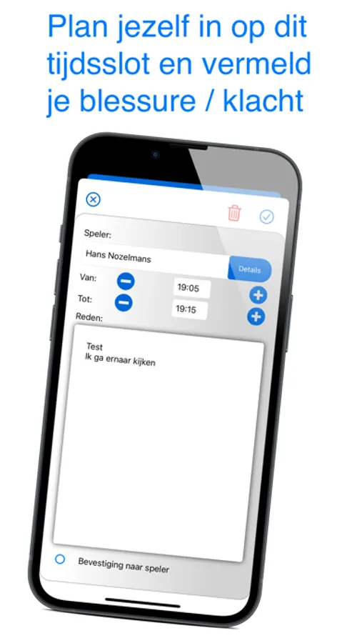 Met deze App wordt het inplannen van verzorging momenten op jouw club een fluitje van een cent. Zo kan je je als speler inschrijven in de beschikbare tijdssloten, en krijg je een bericht als de verzorging jouw verzoek heeft bevestigd. ook kan je jouw afspraak naast het handige overzicht in de App ook in de agenda van je telefoon laten zetten.