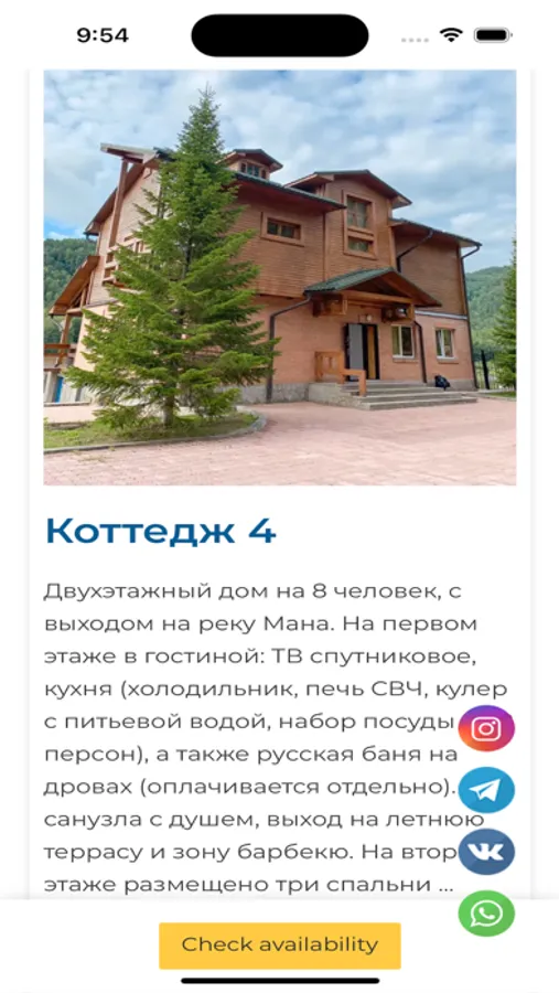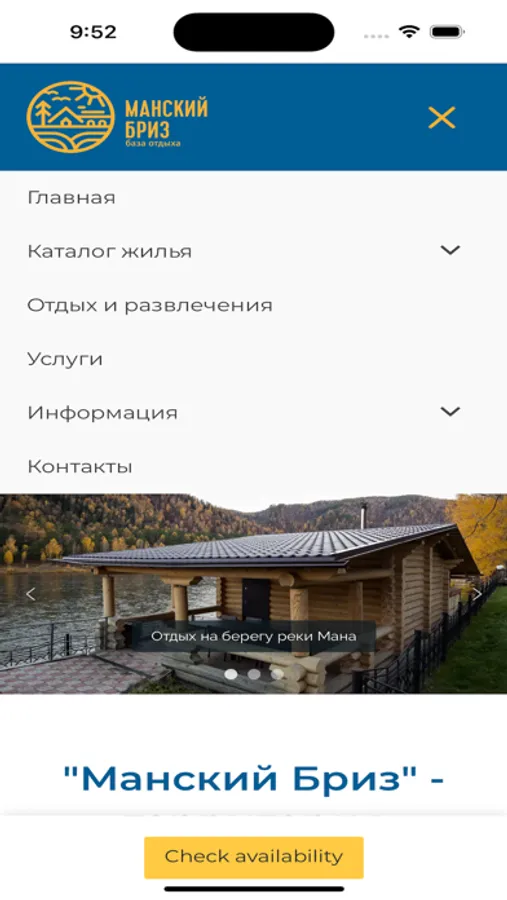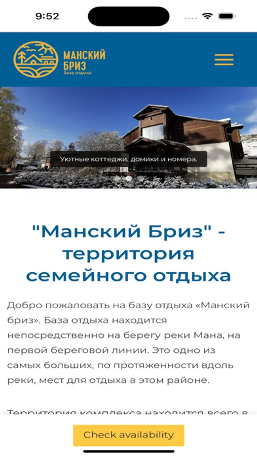 Приложение позволяет ознакомится, и быстро забронировать домик, коттедж или кафе на базе отдыха "Манский бриз".
