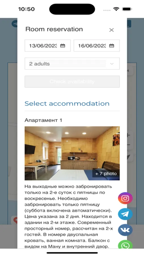 Вы можете проверить доступность бронирования любого объекта на определенные даты, и сразу же забронировать его.