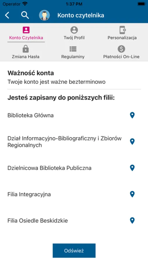 Zalogowany czytelnik może zweryfikować stan swojego konta bibliotecznego, dodawać recenzje czy oceny.
