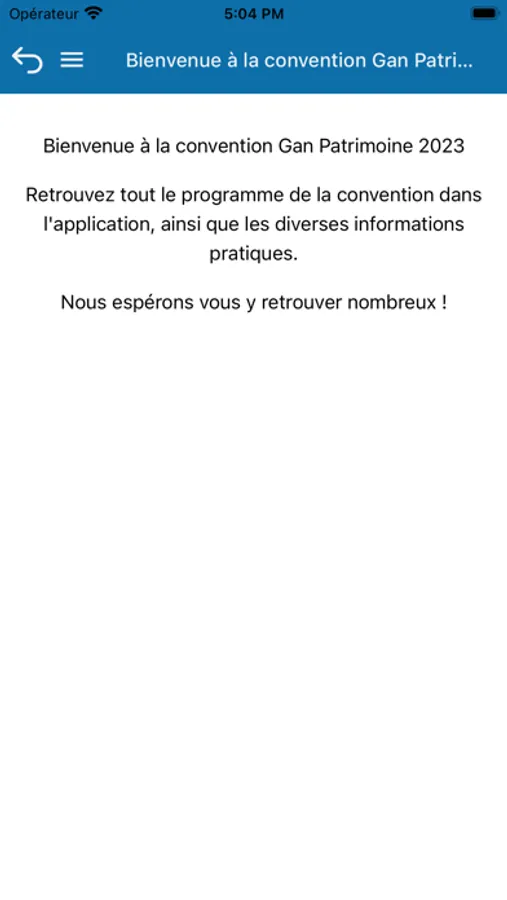 Ceci est une application officielle de la convention Gan Patrimoine qui aura lieu le 9 Mars 2023 avec les différentes fonctionnalités : Inscription, programme, demande de transports, informations pratiques, photothèques et de l'interactivité à travers des quizz et des enquêtes de satisfaction.