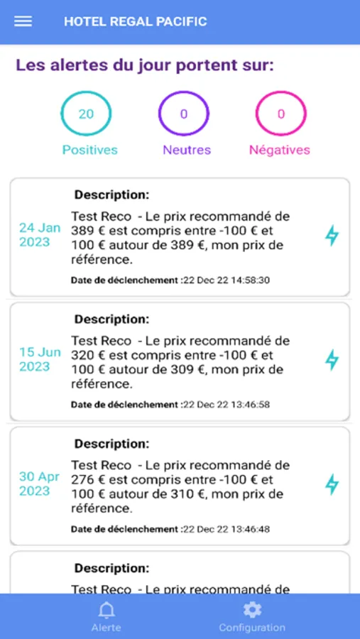 60% des réservations sont faites en horaire non-ouvré, donc quand vous n’êtes pas aux commandes. Soyez alerté en temps réel de toutes les anomalies de réservations et ne loupez plus aucun Pickup. Décidez d’une stratégie, et automatisez-la. Grace à des modules d’IA de nouvelle génération, la prévision de la demande, la gestion des risques d’annulation ou encore la préconisation tarifaire devient accessible et facilement compréhensible.
