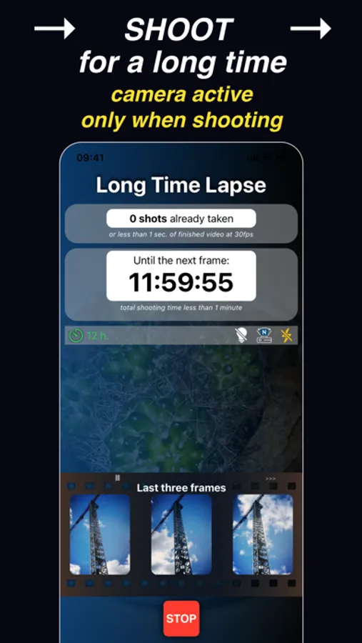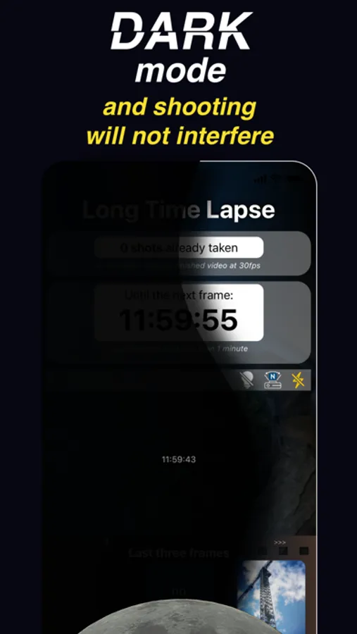 - During shooting, you can see the remaining time before shooting the next frame, the total shooting time and the duration of the video that can be collected from the captured frames at standard video assembly settings, as well as the total number of frames already taken. In addition, the previous three frames are displayed. The time remaining until the next frame is taken is also displayed in dark mode.