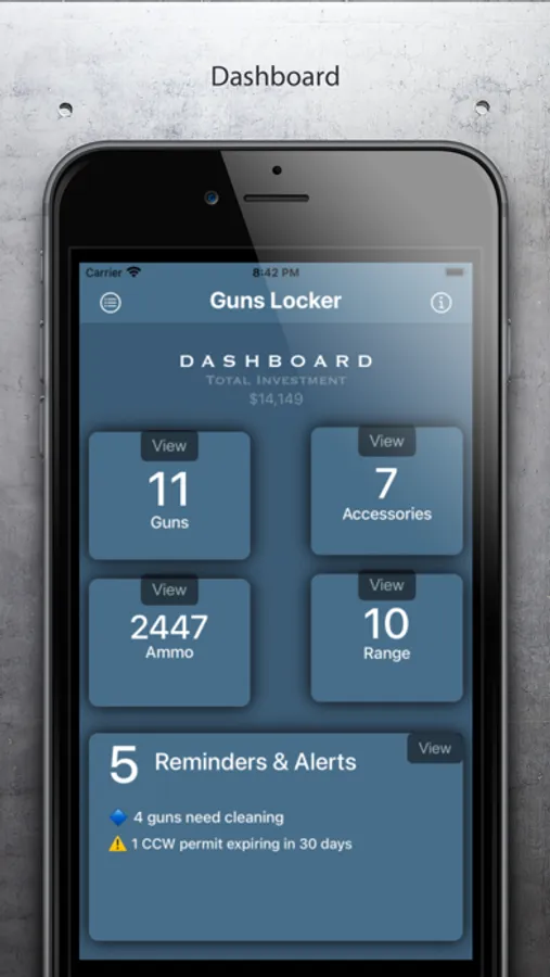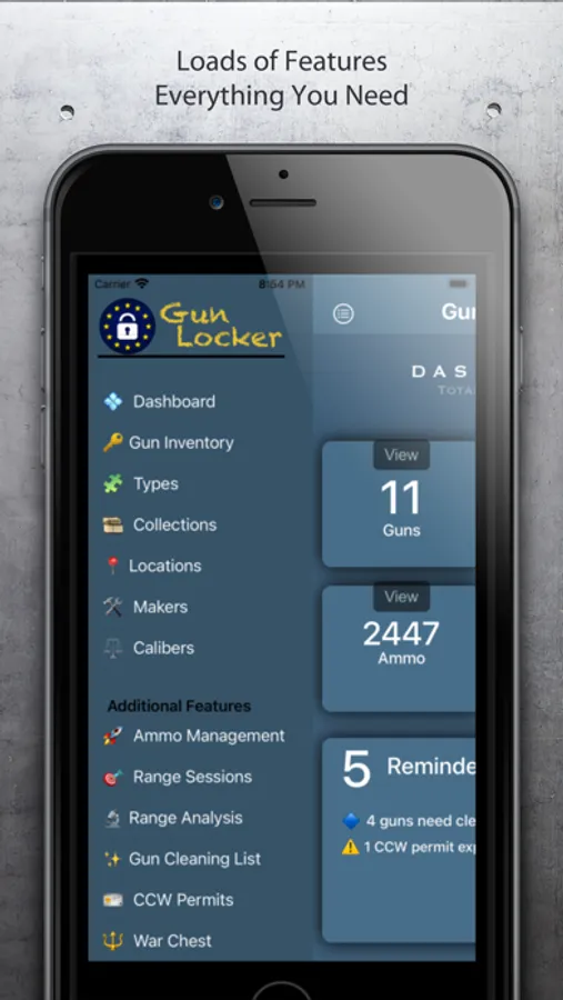 Guns Locker helps you keep track of your Firearms, Ammo, Accessories, Range Sessions, CCW Permits — and more.