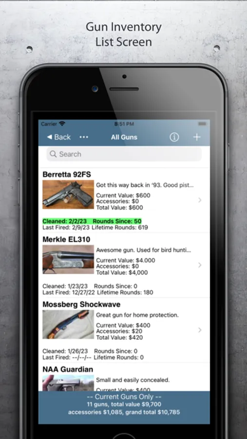 ** Gun Inventory keeps detailed inventory data about each gun. Includes multiple filtering, sorting and reporting options. Also provides the ability to keep track of sold guns.