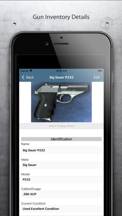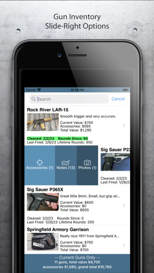 ** Photo Gallery lets you keep an unlimited number of photos for each inventory gun. The photo viewer lets you swipe through your photos with ease. You may also share your photos with others (text, email, print, etc).