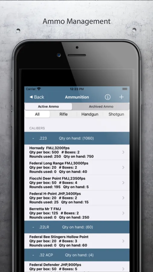 ** Ammo database keeps track of your ammo by caliber and gun type. It automatically tracks ammo usage and costs while providing accurate and up to date quantity-on-hand totals. When used with the Range Sessions feature, the ammo database is automatically updated with the ammo used and rounds spent, thus providing accurate Qty-On-Hand totals. The ammo database can also be used as a stand-alone database without using the Range Sessions feature.