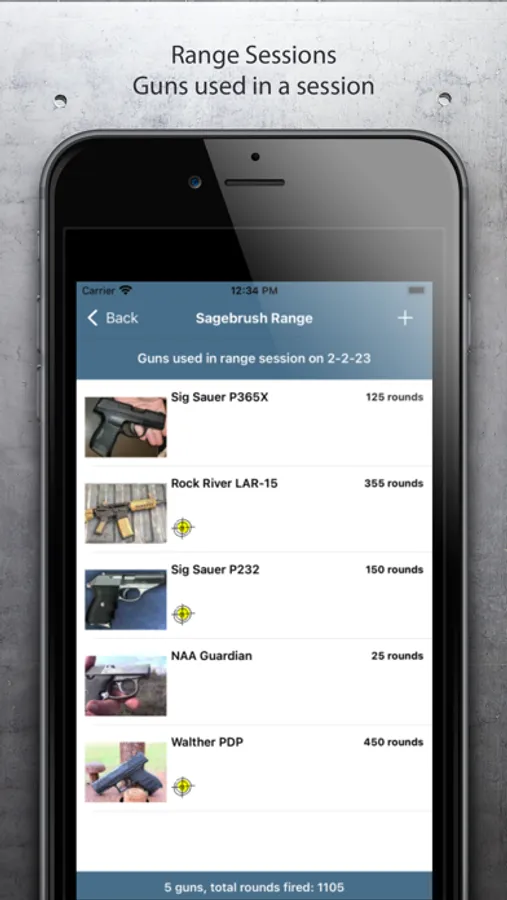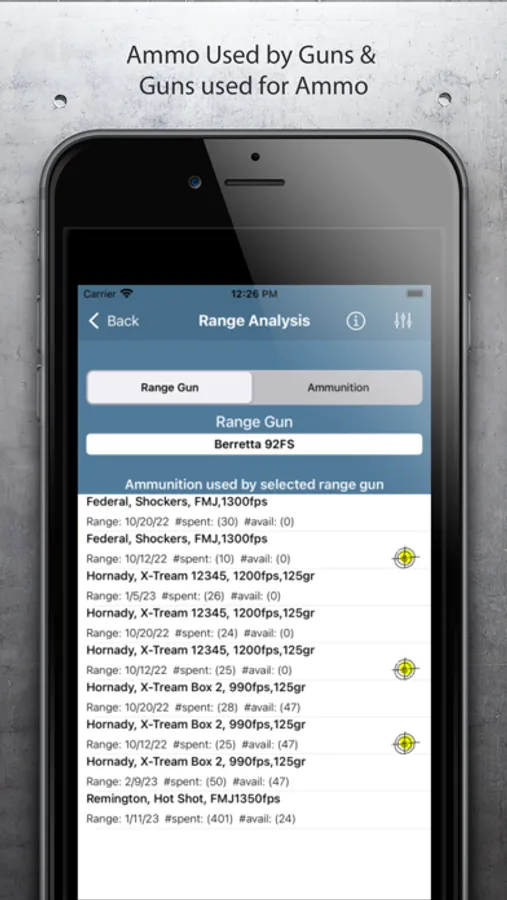 ** Range Sessions & the Range Analysis Tool helps you keep track of your range visits, range costs, which guns were used, and what ammunition was used for each gun. You can save and share multiple photos of your targets for each range gun. The Range Analysis Tool digs even deeper to show all ammo used by a specific range gun as well as show all range guns that used specific ammo.