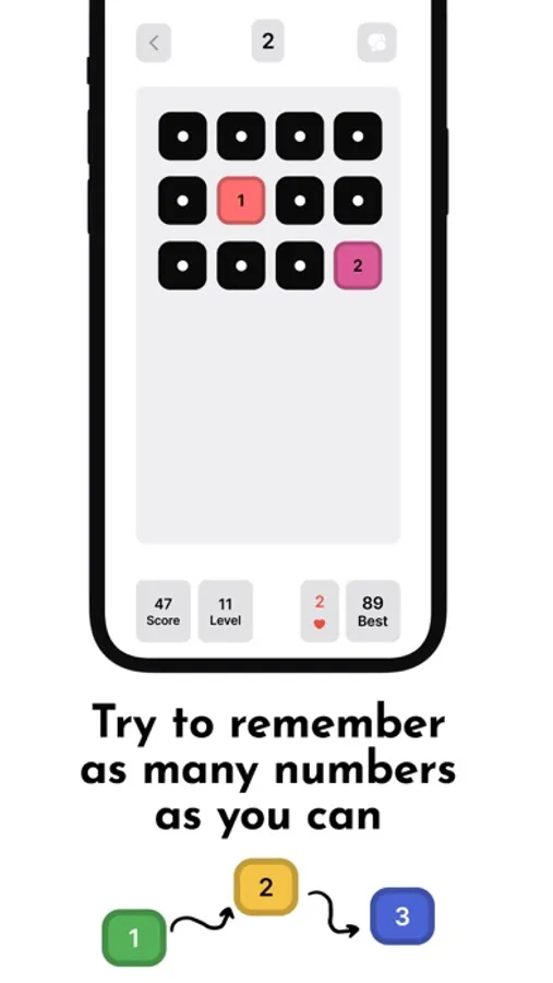 The game will keep track of the player's high score, encouraging them to continue playing and improving their memory skills. With its simple but challenging gameplay and fun power-ups and obstacles, "Memory Numbers" is a game that will keep players entertained and engaged while also helping them improve their memory and cognitive abilities.