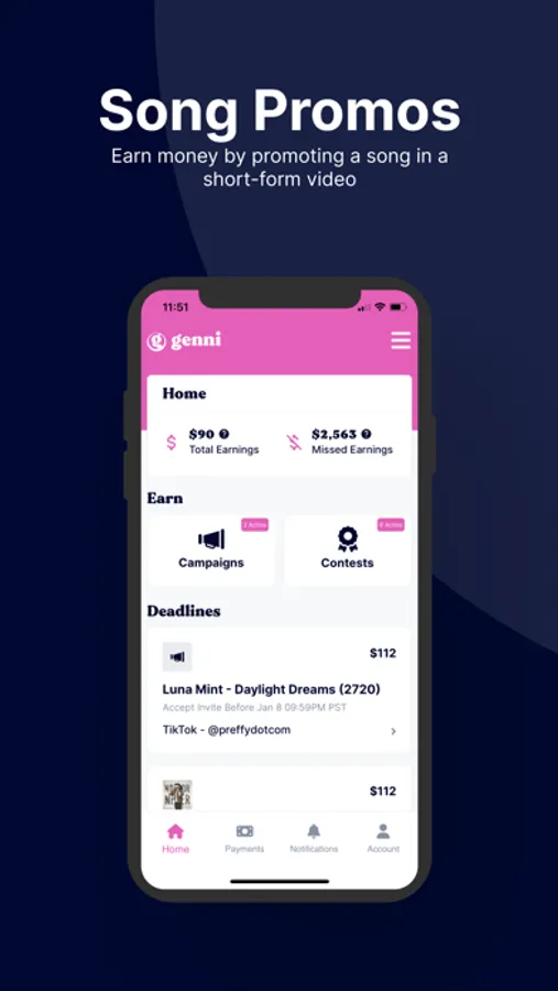 Welcome to Genni! We're a tool for short-form content creators to monetize their following. With Genni, you can earn money by promoting songs and brands. Plus, we offer contests and other opportunities for creators to earn even more. Whether you're a mega-star, or just love creating content, Genni is here to help you turn your passion into a career. Give us a try and start monetizing your content today!