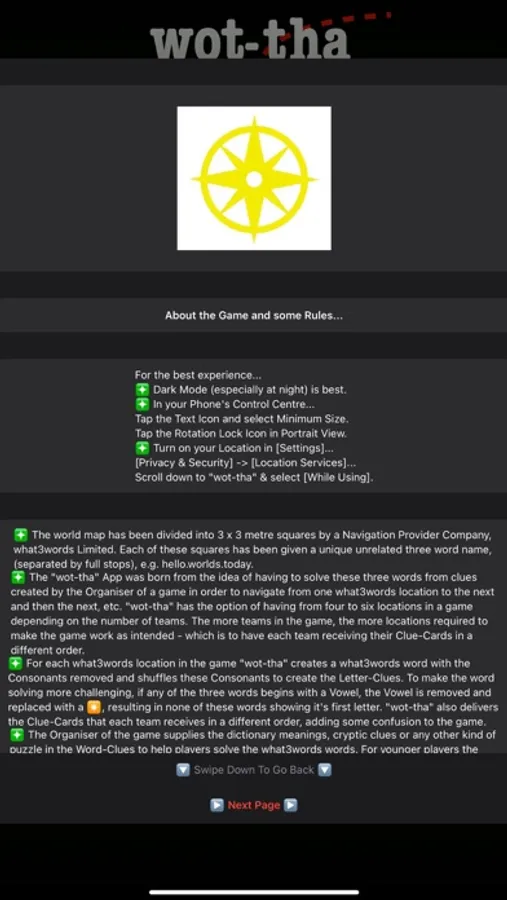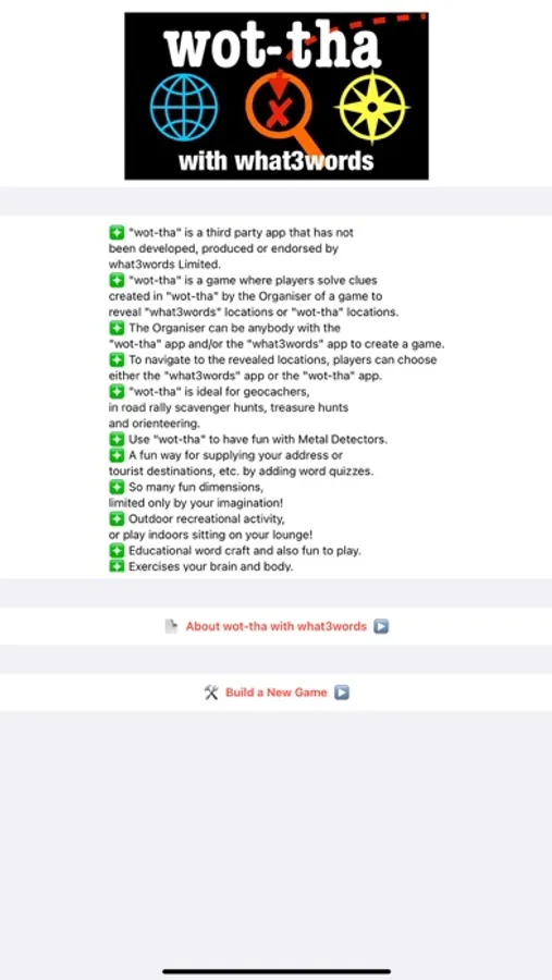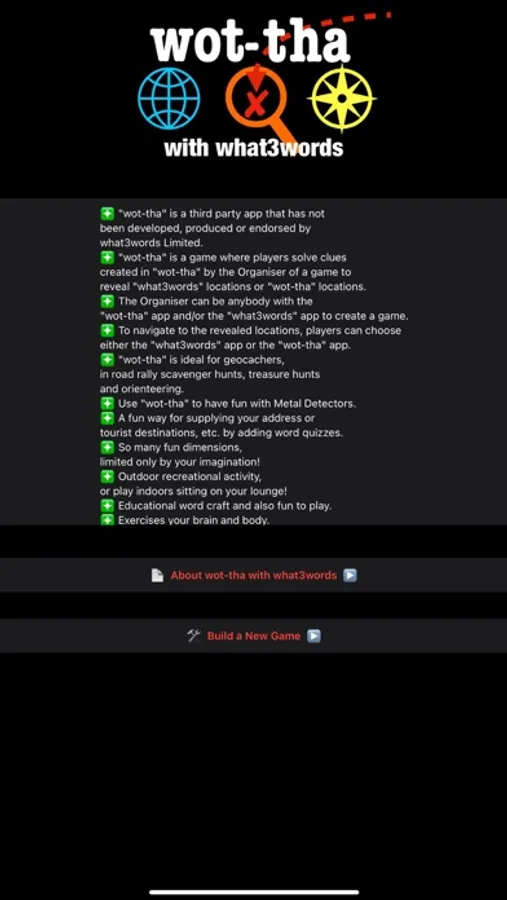 "wot-tha" is a game where players solve clues created in "wot-tha" by the Organiser of a game to reveal "what3words" locations or "wot-tha" locations.