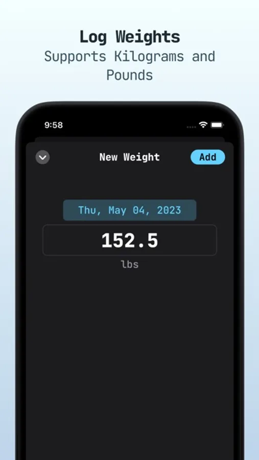 > Log your weight in Kilograms (KG) or Pounds (LBS)