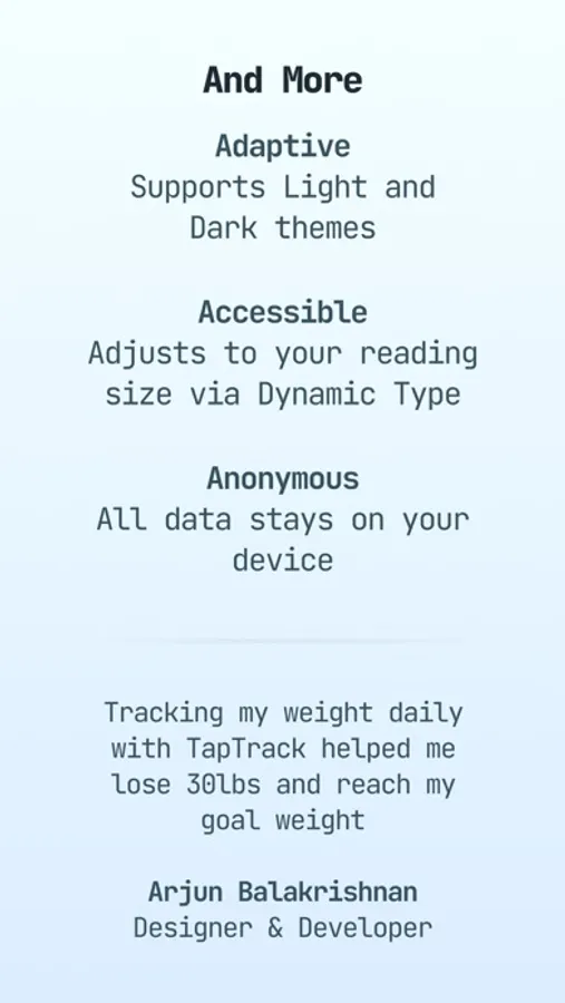 TapTrack is an indie app. I used it daily during the development process to track my own weight. Regular weigh-ins played a key role in helping me lose over 30lbs within a year.