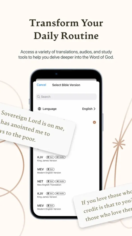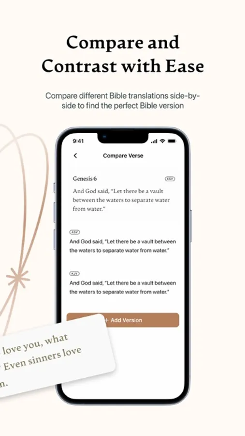 Our app features a powerful compare verses function that allows you to easily compare different translations side-by-side. Whether you're studying the King James Version, New International Version, or any of our other translations, you can easily gain a deeper understanding of the nuances of each translation and how it affects the meaning of the text.
