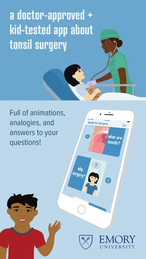 Ready for Tonsillectomy is an educational app for kids and families. It shows what to expect before, during, and after your tonsil surgery. This app was kid-tested and doctor-approved in a research study at Children’s Healthcare of Atlanta.