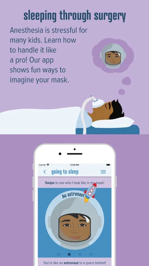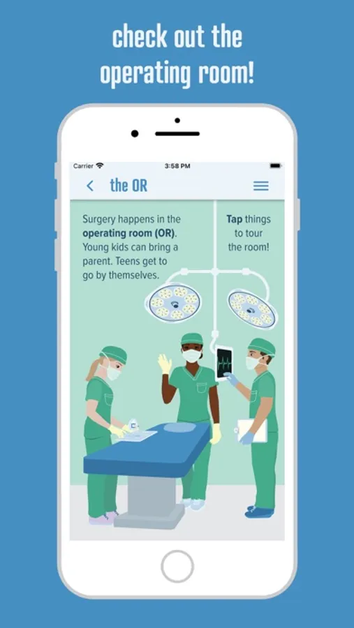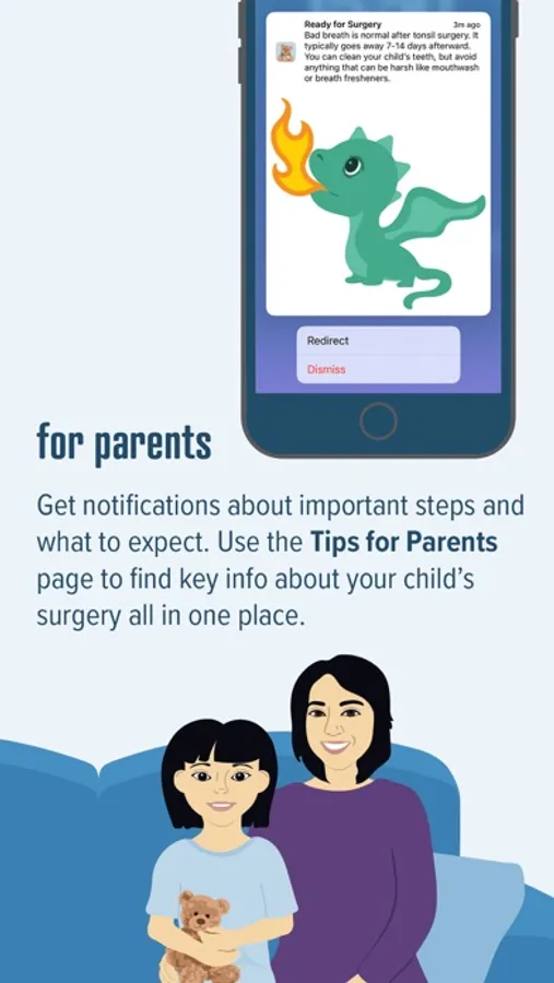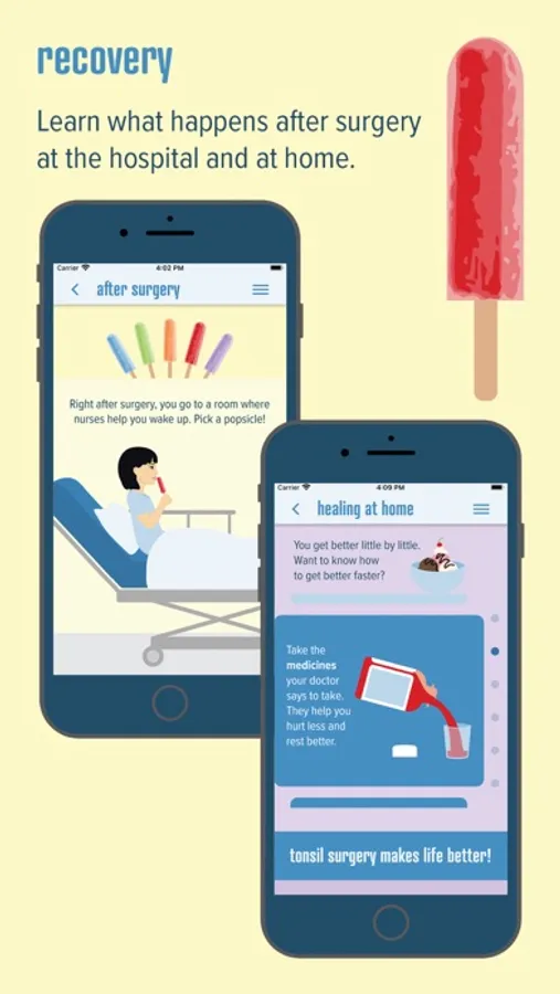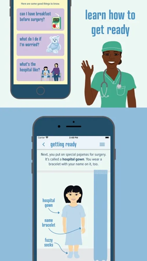 The app uses kid-friendly language, animations, and analogies to help you and your family learn about surgery. You’ll learn about reasons for tonsillectomy, what to do before surgery, anesthesia, and recovery at home. The app suggests good ways to feel less nervous. It also has information for parents, plus reminder notifications about important steps to take and normal symptoms to expect.