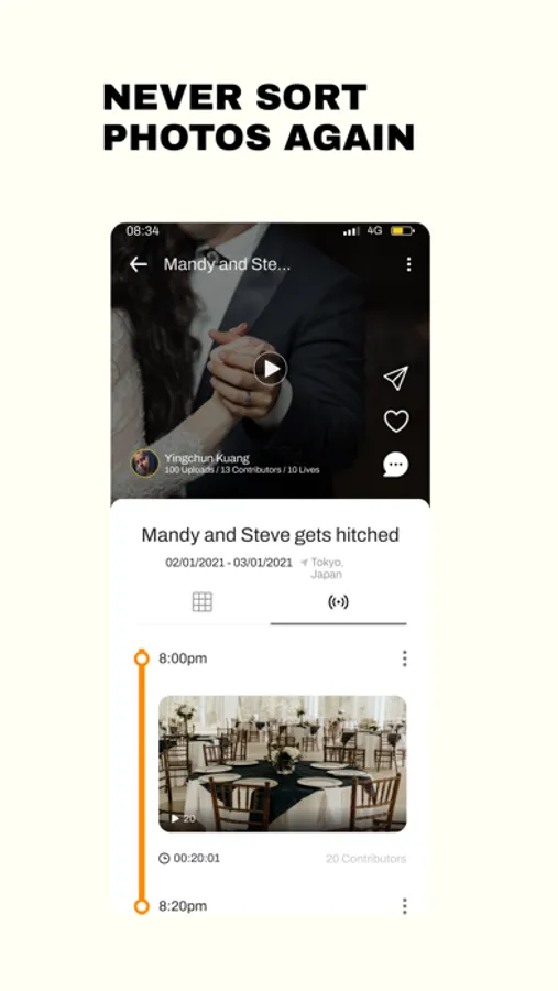 Upload your images in batches and let our app automatically sort it out into a timeline for you. Never sort your media files again. Easily share a QR Code or link for your event attendees to easily contribute media files to your memory. No more manually chasing everyone to pass you their photos and videos. View live events from the multiple views/angles of fellow attendees live streaming at your event. It’s time to store and relive your memories in a more hassle-free and meaningful way.