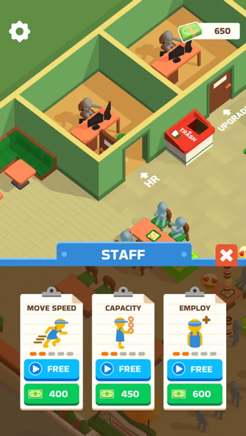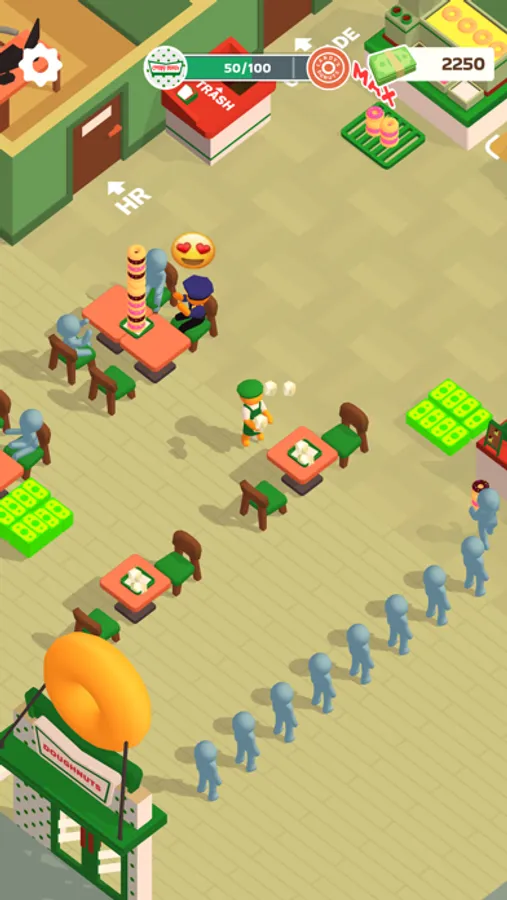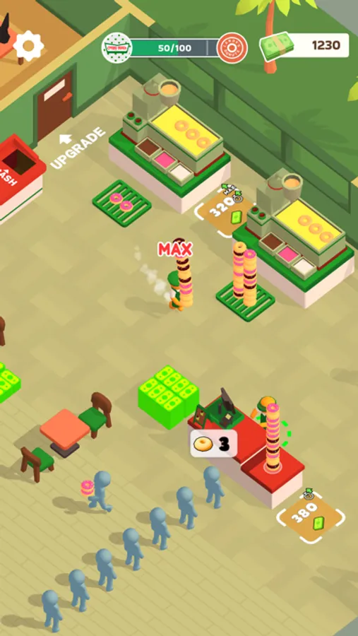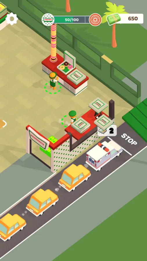 The store is getting bigger! But don’t you think it would be troublesome if there was only one worker? Manage your store efficiently by hiring staff to make donuts as well as cashiers! If you have slow employees, you can upgrade their ability!