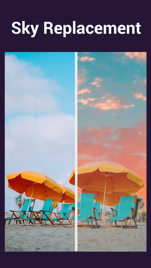 The gloomy weather is just not what you want? Bring the best out of your picture with our sky replacement. Replace the gray, boring sky in your photo with a brand new sky. Choose from clear blue sky, sunny, sunset, storm and even fantasies skies.