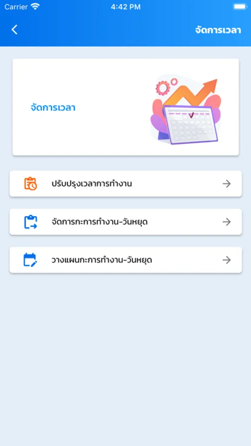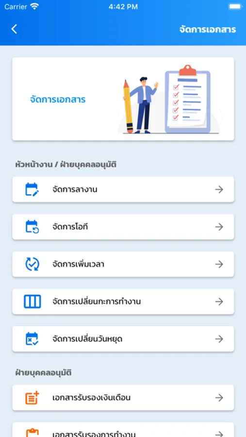 - จัดการเอกสาร เช่น ขอโอที การลา แก้ไขเวลา เปลี่ยนกะการทำงาน เปลี่ยนวันหยุด ขอเบิกล่วงหน้า
