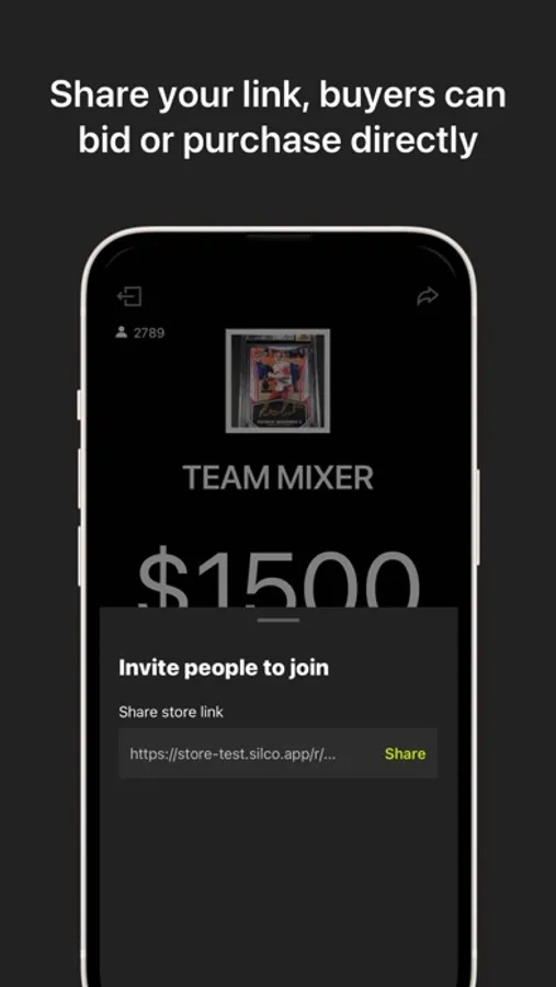Add your items and share your Silco store link. Buyers can buy or bid directly after opening the link. If you're live streaming on social media, you can also open the Silco app on another device in front of your camera. That way, everyone can see your items and prices displayed like a digital board!