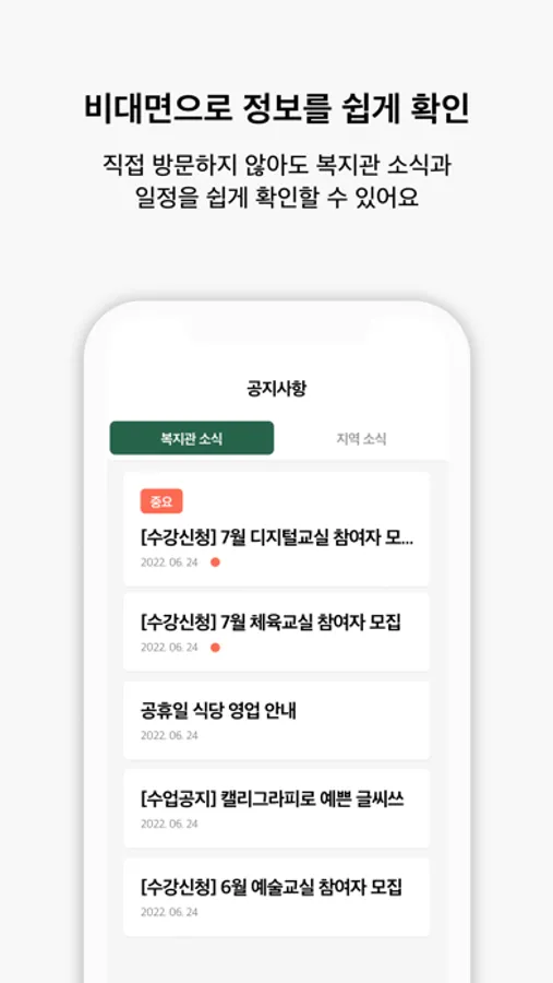 - 복지관에서 진행되는 행사, 공지사항 등 관련된 정보 확인