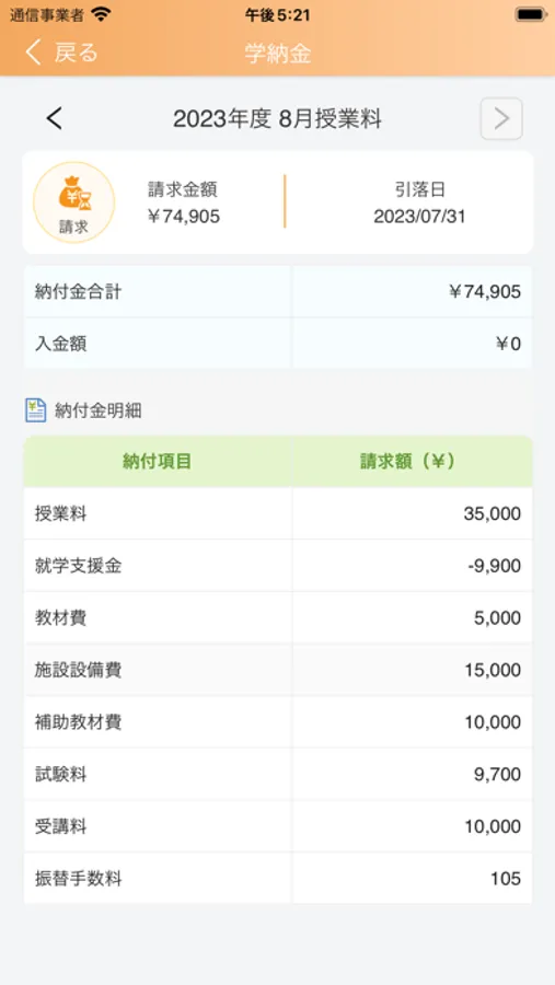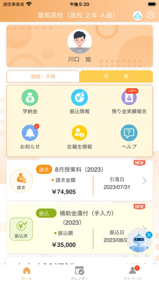 1.学納金の請求・振込額の通知を受信、金額の確認