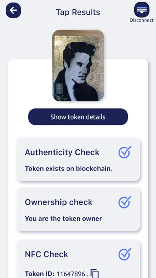 3. Authentication: Users can scan an already initialized chip, the metadata of the authenticity token will then be searched for and displayed.