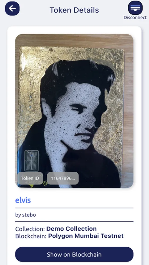 1. Initialization of chips: Users can use the app to scan and initialize chips, i.e. generate new private/public key pair on the chip, create an authenticity token on the blockchain and add metadata such as title, image, description and some freely selectable attributes (traits).