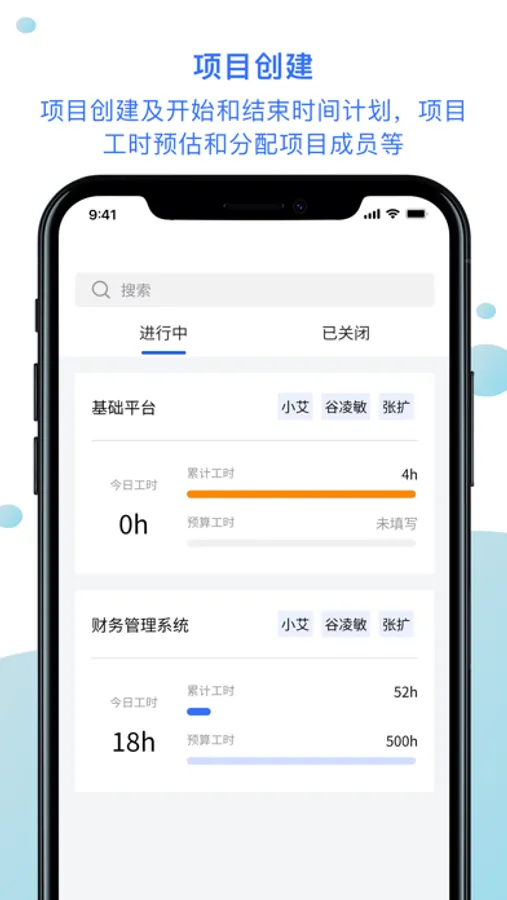 项目创建及开始和结束时间计划和预算,任务工时预估和分配项目成员等。