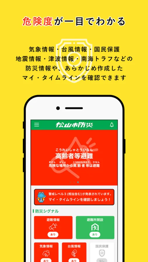 警報や避難情報の発令時などに、警戒レベルごとのプッシュ通知やアプリ画面内のアイコンの色で危険をお知らせし、あらかじめ作成しておいたマイ・タイムラインを速やかに確認することが可能です。