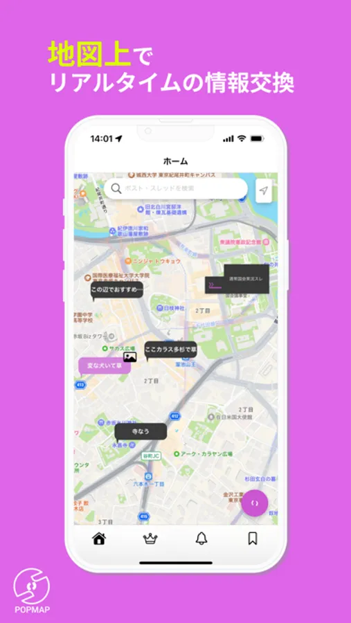 POPMAPは、地図の上で広がる全く新しいSNSです。どこで何があったのかをリアルタイムで知ることができますし