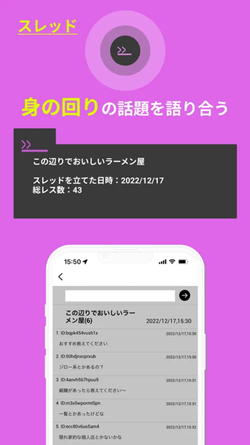 地図の上で気になるトピックを思い浮かべたら、スレッドを立てることもできます。気になる話題について、いろんな人と話し合ってみましょう!