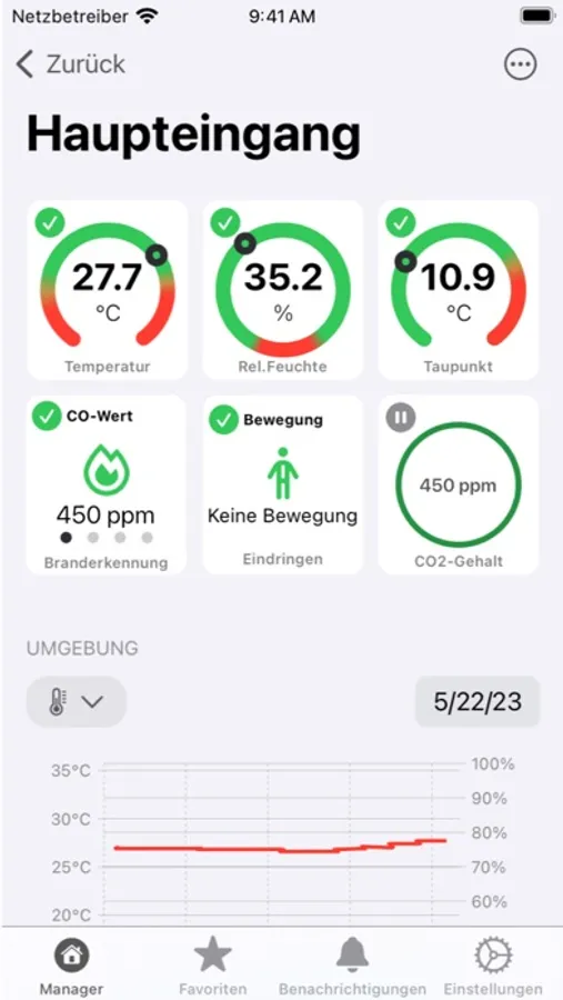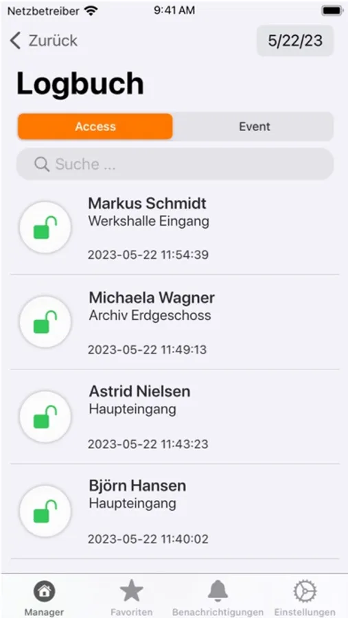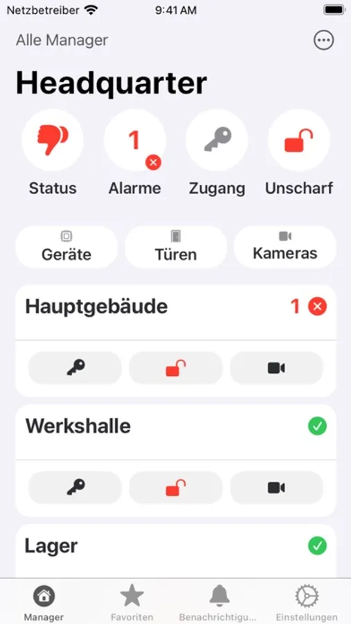 The app reports intrusions, critical environmental parameters such as temperature, humidity and many other parameters. Furthermore, you receive information about fires at an early stage. In addition, it shows who, when and where doors were opened with additional live video images. In addition to alarms, messages and recordings of critical conditions, you can also remotely open doors or block them for people and see who is where via live video. The intrusion detection function can arm or disarm any area or show you open windows and doors.