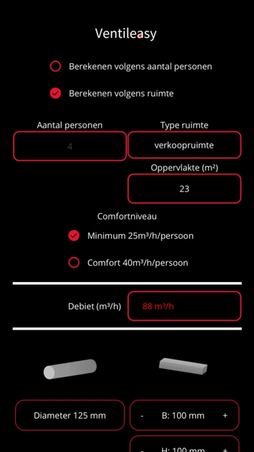 4. de app geeft je de afmeting van de ventilatiekanalen, die je vervolgens nog naar wens kan aanpassen