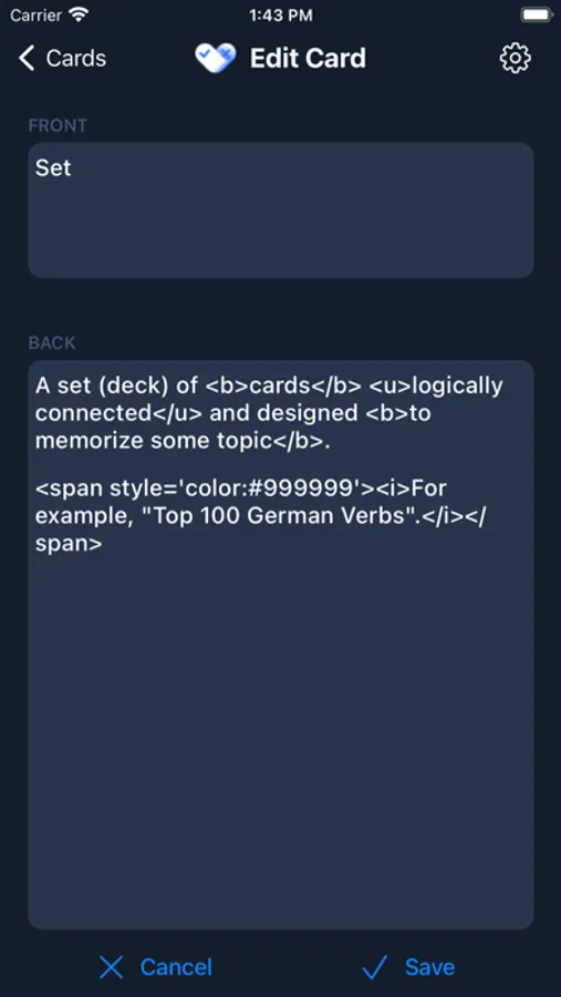 - Support for HTML tags in cards