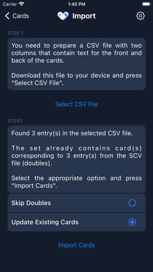 - Ability to update previously loaded cards when importing