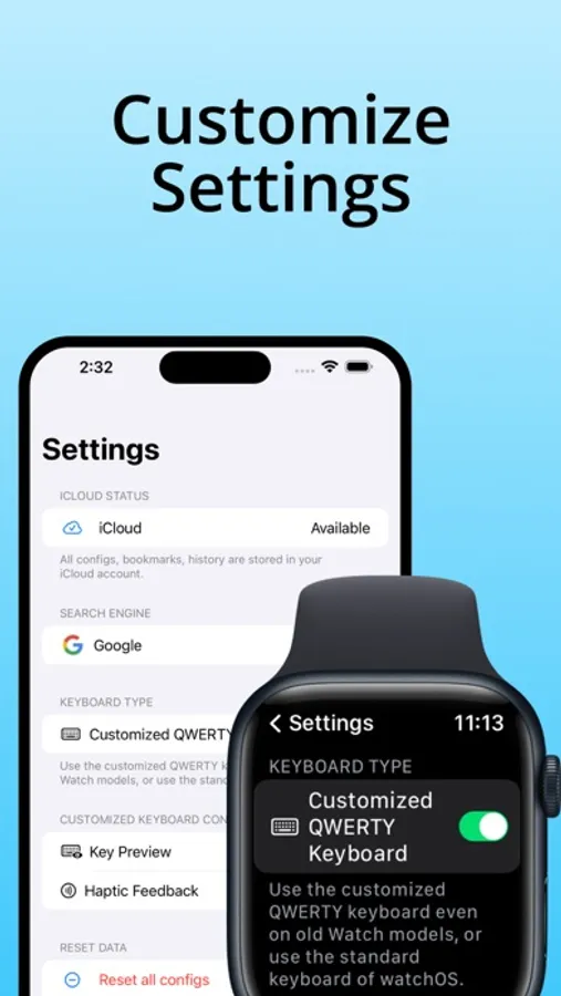 - Multiple keyboards supported. The standard keyboard of watchOS or the customized QWERTY keyboard.