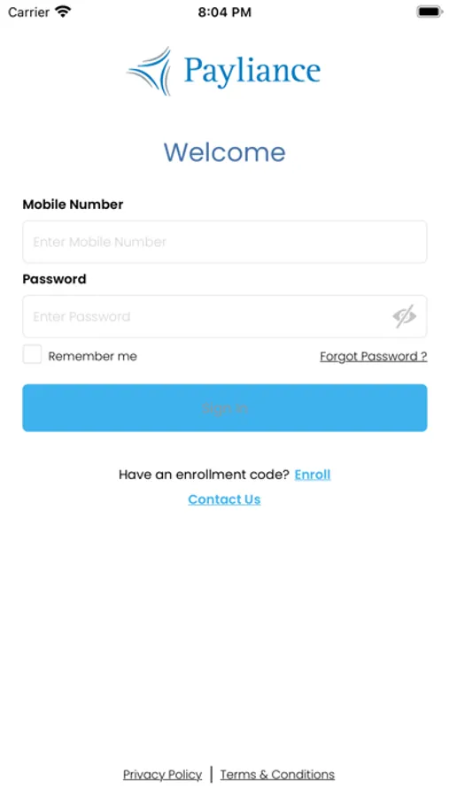 To log in please refer to the Enrollment Code. If you no longer have your Enrollment Code or the code is no longer valid, please contact us directly at mobileappsupport@payliance.com for a new code.
