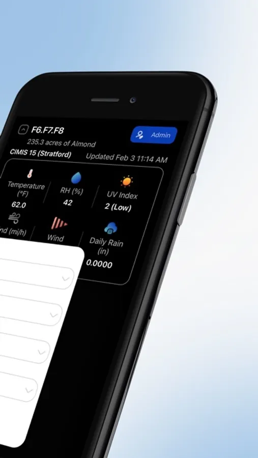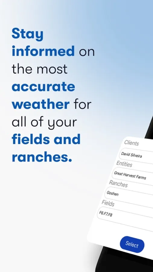 Client Screen - Stay informed about the most accurate weather information for all of your fields and ranches. Easily view maps, schedules, events, and reports by selecting your clients, ranches, and fields.