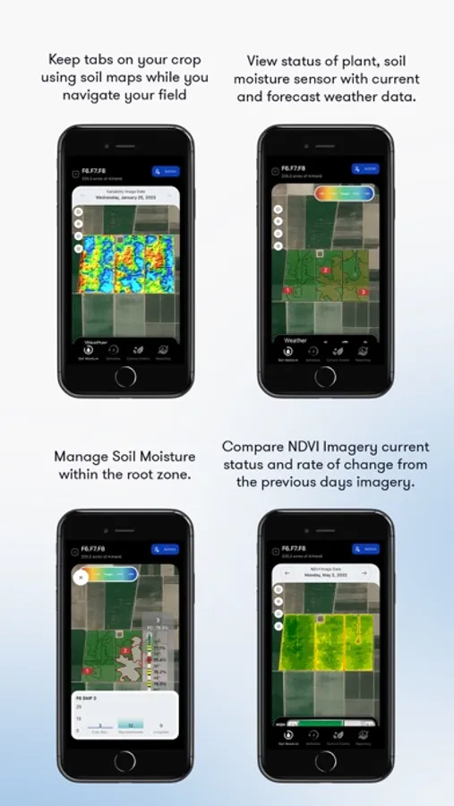 Soil Management Screen - Keep tabs on your soil maps, plant and soil moisture sensor data, weather forecast, and daily NDVI imagery current status and rate of change from the previous days imagery. Utilize location services to navigate fields, take geolocated images, and make agronomic notes. Monitor irrigation sets, irrigation requirements for the week, and water usage in fields and ranches all on one screen.