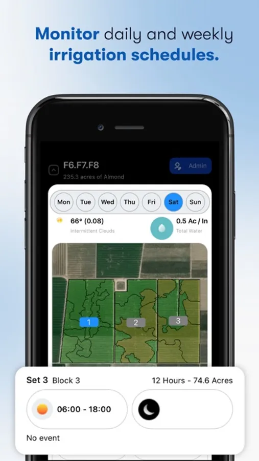 Scheduling Screen - Monitor weekly irrigation schedules in terms of hours and inches applied, and daily schedules in terms of times on and off for irrigation. Edit irrigation schedules and send updates to existing automated pumps and valves in your ranches or fields.