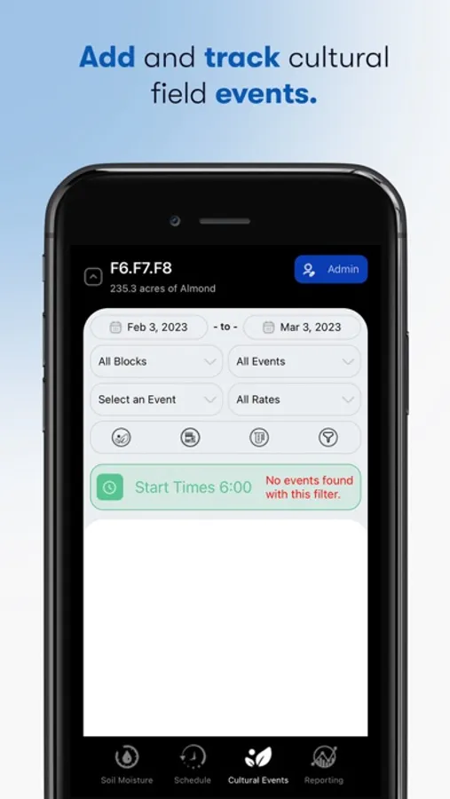 Cultural Event Tracking - Add and track cultural field events, and IM Scheduler will adjust irrigation schedules to accommodate the field work. Review historical field cultural events.